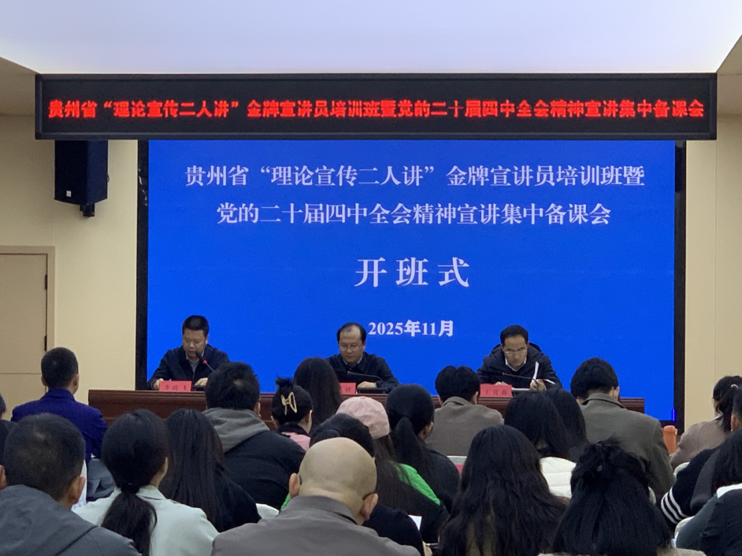 11月12日至14日,贵州省“理论宣传二人讲”金牌宣讲员培训班暨党的二十届四中全会精神宣讲集中备课会在贵阳举办。省“理论宣传二人讲”工作专班常务副组长,省社科联党组成员、副主席黄昌祥出席开班式并讲话。专班成员、省委宣传部理论处处长王贵森,专班成员、办公室主任李政飞参加开班式。开班式上为朱先进、李锦楷等二十名宣讲队员颁发了贵州省“理论宣传二人讲”金牌宣讲员证书。各市(州)及省直相关单位宣讲骨干、市(州)专班和相关部门“理论宣传二人讲”工作负责人、金牌宣讲员和省社科联机关干部70余人参加培训。