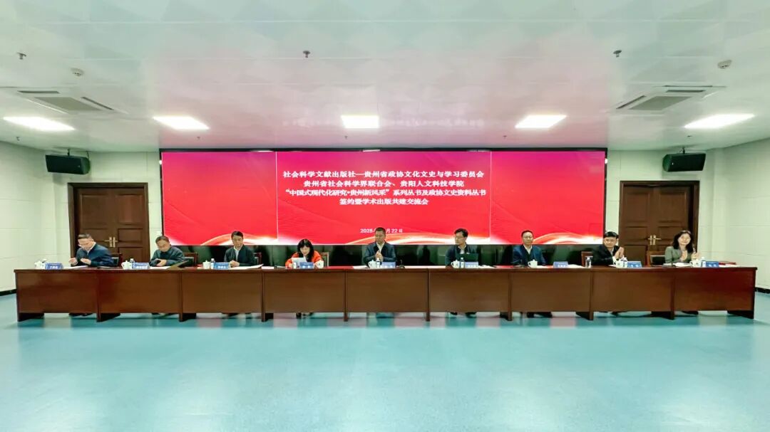 2025年10月22日,社会科学文献出版社党委书记、社长冀祥德一行,在贵阳市与贵州省政协文化文史与学习委员会、贵州省社会科学界联合会、贵阳人文科技学院进行学术出版交流活动并签署共建协议。