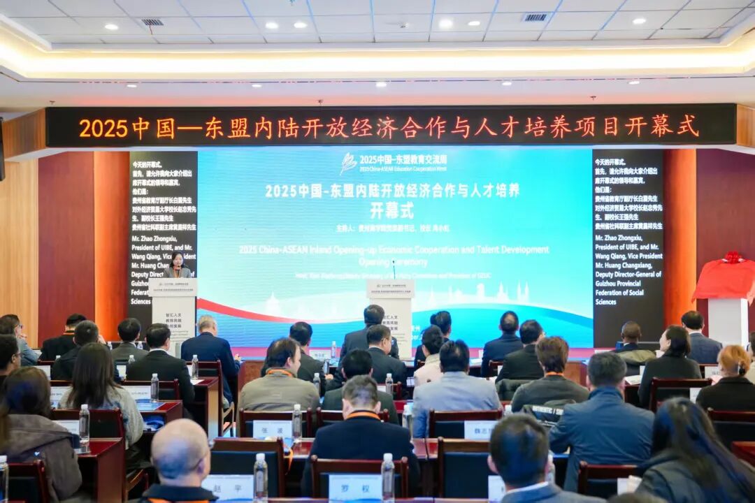 11月25日,由对外经济贸易大学、贵州省社会科学界联合会及贵州商学院共同主办的“2025中国—东盟内陆开放经济合作与人才培养”活动在贵州商学院举行。对外经济贸易大学校长赵忠秀出席并作主旨报告。对外经济贸易大学副校长王强,省社科联党组成员、副主席黄昌祥,省教育厅党组成员、副厅长白震,贵州商学院党委书记汤健出席开幕式并致辞。开幕式由贵州商学院党委副书记、校长肖小虹主持。